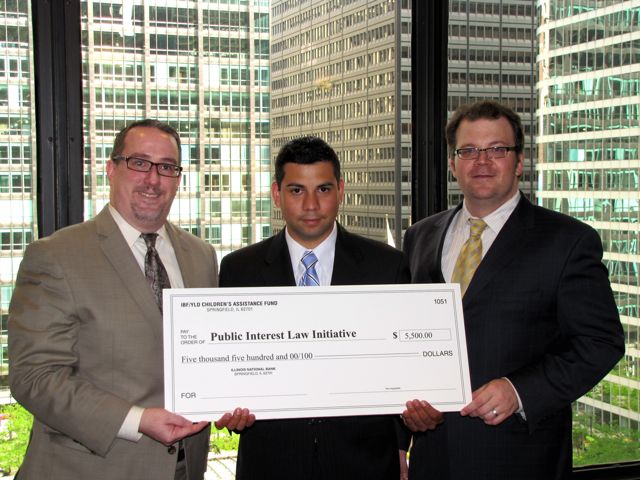 The IBF/YLD Children's Assistance Fund approved a grant of $5,500 to sponsor an ISBA/YLD Summer Intern at Public Interest Law Initiative (PILI) for the summer. PILI Executive Director Michael Bergmann (left) received the check from YLD Chair Bob Fink (right). This grant will provide for intern Arturo Hernandez (center), a law student at John Marshall Law School, to work at the Chicago Coalition for the Homeless this summer.Filed under: