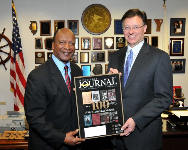 Illinois State Bar Association (ISBA) President John G. Locallo (right) presented an oversize copy of the cover of the 100th anniversary edition of the Illinois Bar Journal, the monthly magazine of the ISBA, to Illinois Secretary of State Jesse White, in his capacity as State Librarian, on Tuesday, Jan. 31. An actual copy of the magazine was donated to the library for its archives and will be made available to the public.