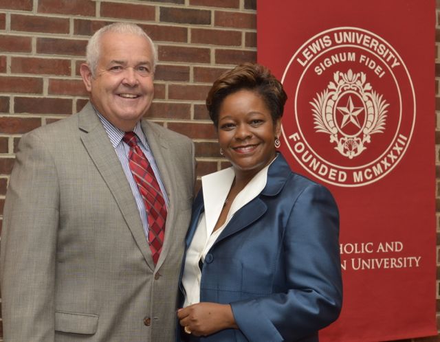 Justice Lisa Holder White of the 4th District Appellate Court was honored with an Alumni Achievement Award from Lewis University on Sept. 28. Justice White, a 1990 graduate of Lewis, became the first African-American female on the 4th District Appellate Court earlier this year. Justice White is shown being congratulated by ISBA Board member and fellow Lewis alum Al Durkin.