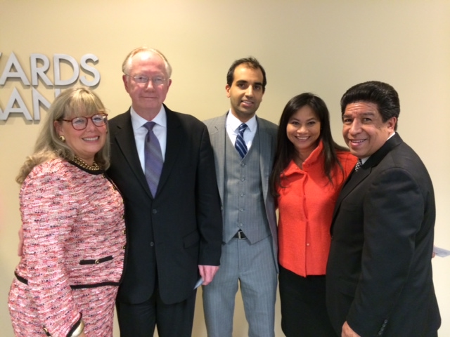 ISBA President Paula H. Holderman attended the Indian American Bar Association Installation Ceremony on Thursday, Jan. 23. On hand for the installation were (from left) President Holderman, Illinois Supreme Court Justice Thomas Kilbride, new president of the Indian American Bar Association Tejas Shah, a member of the ISBA New Lawyer Task Force, Aurora N. Abella-Austriaco and speaker 1st District Appellate Justice Jesse Reyes.