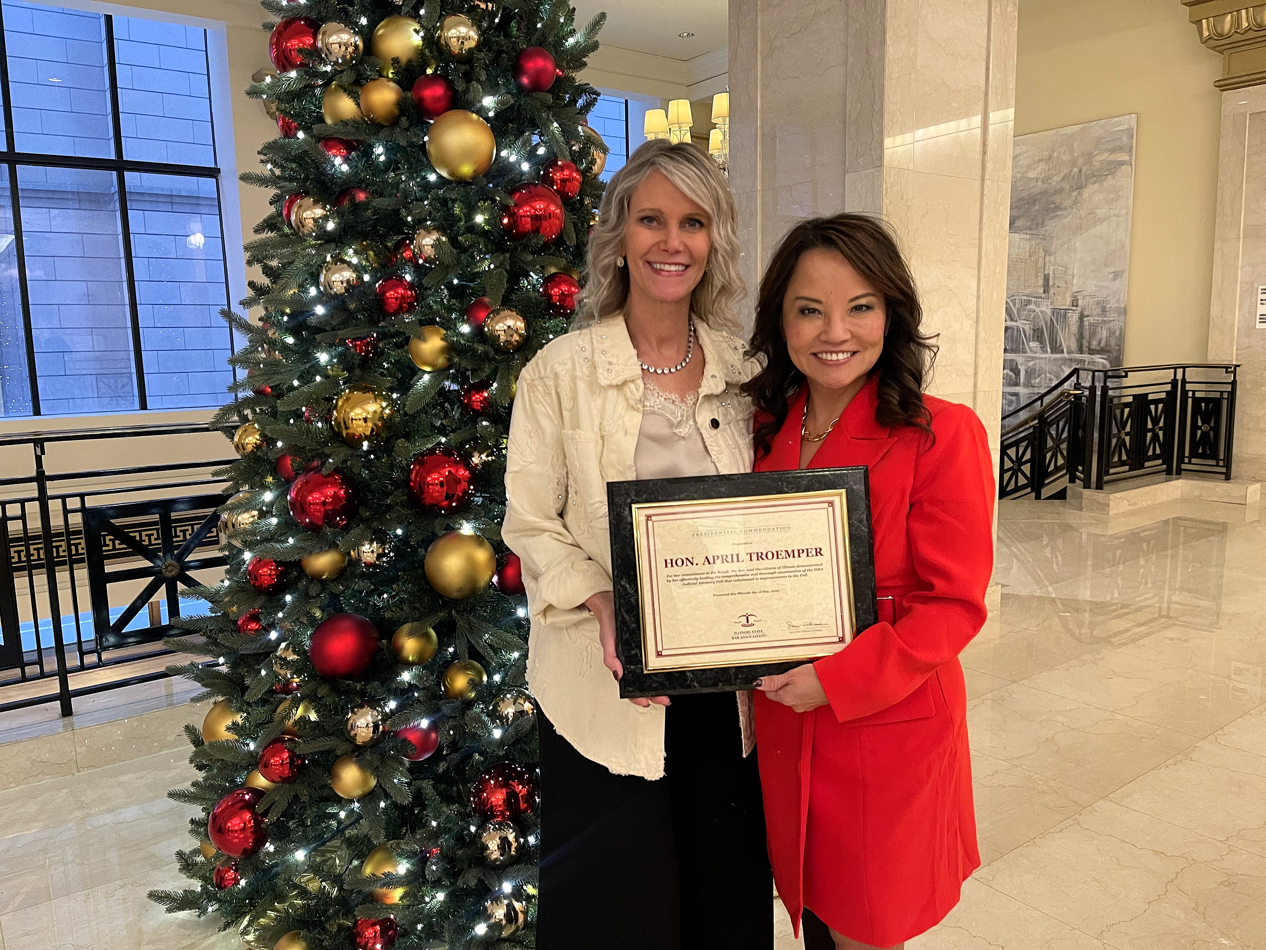 On December 12, the Hon. April G. Troemper received the Presidential Commendation from ISBA Immediate Past President Sonni Choi Williams in recognition of her outstanding service on the Standing Committee of Judicial Advisory Polls. Judge Troemper was honored for her leadership of the Committee, including guiding the drafting of revised poll questions that were unanimously approved by the ISBA Board of Governors. She currently serves as the Committee’s Ex-Officio.